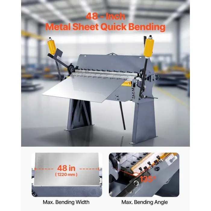 Машината за ламарина обработва метални листове с ширина до 48" с ъгли на огъване от 0° до 135°, което го прави идеален за средно големи производствени цехове и проекти с тежки профили.