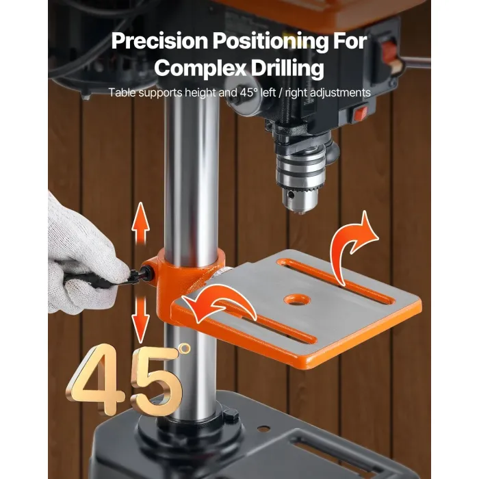 Изпитайте несравнима гъвкавост и стабилност с дебелата метална работна маса, която се регулира по височина и се накланя до 45°. Нашата настолна бормашина е идеална за прецизни и сложни задачи по пробиване на отвори, което я прави безценен инструмент за всяка работилница.