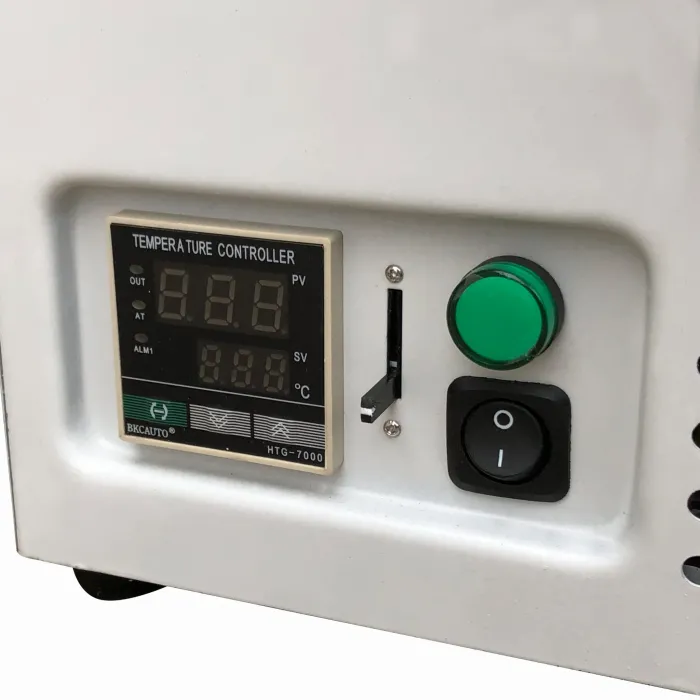 Контролният панел е оборудван с дисплей, който показва текущата температура на лепилото. Освен това, до превключвателя има плъзгач за скоростта на подаване на лентата. Устройството може лесно и бързо да се преобразува в стационарна машина. Всички необходими елементи са включени в комплекта.