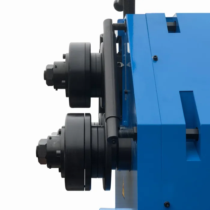 Радиусът на огъване може лесно и бързо да се настрои с помощта на затягащото устройство в горната част на машината. Машината е оборудвана с регулируеми ролки за огъване на различни видове профили, плоски пръти и ъгли. Освен това, страничните ролки предотвратяват въртенето на материала. Нов професионален модел с възможност за вертикално огъване. Работи дясно и ляво. Възможност за огъване на различни профили благодарение на универсални ролки. Мощният 2,2 kW мотор осигурява перфектни параметри на огъване дори при дебели материали.