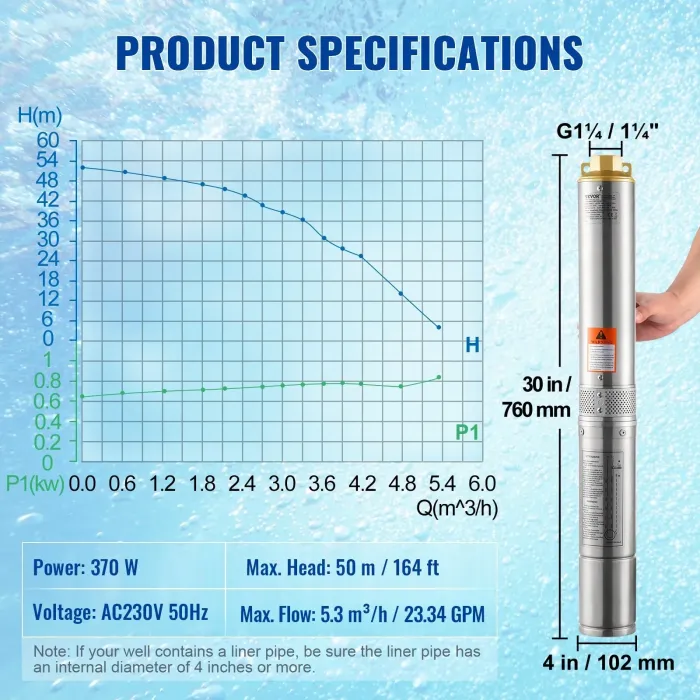 Мощност: 370 W, 230 V; Нагнетателен отвор: G1¼ (Диаметърът на обсадната тръба на кладенеца трябва да е с 10 мм по-голям от диаметъра на помпата). Тази потопяема помпа за дълбоки кладенци е проектирана със 7-степенни термопластични работни колела, осигуряващи максимален дебит от 5,3 м³/ч и максимален напор от 50 м. Предлага се с 9,1 м електрически кабел, което значително улеснява живота без модерни водопроводни инсталации. Изпомпвайте с лекота и се отпуснете. Няма предизвикателство, което да е твърде голямо за вас.