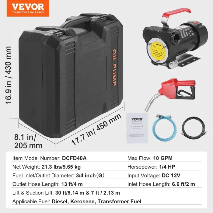 Оборудвана с високоскоростен безчетков двигател с мощност 1/4 к.с., тази дизелова помпа за прехвърляне доставя гориво с дебит до 10 GPM, с максимална височина на повдигане 30 фута (9 метра) и всмукателна височина 7 фута (2,1 метра). Тя може да прехвърли 55-галонен варел дизел за по-малко от 4 минути. Тази помпа е предназначена само за дизел, керосин и трансформаторно гориво. Не я използвайте за бензин, моторно гориво или други течности.