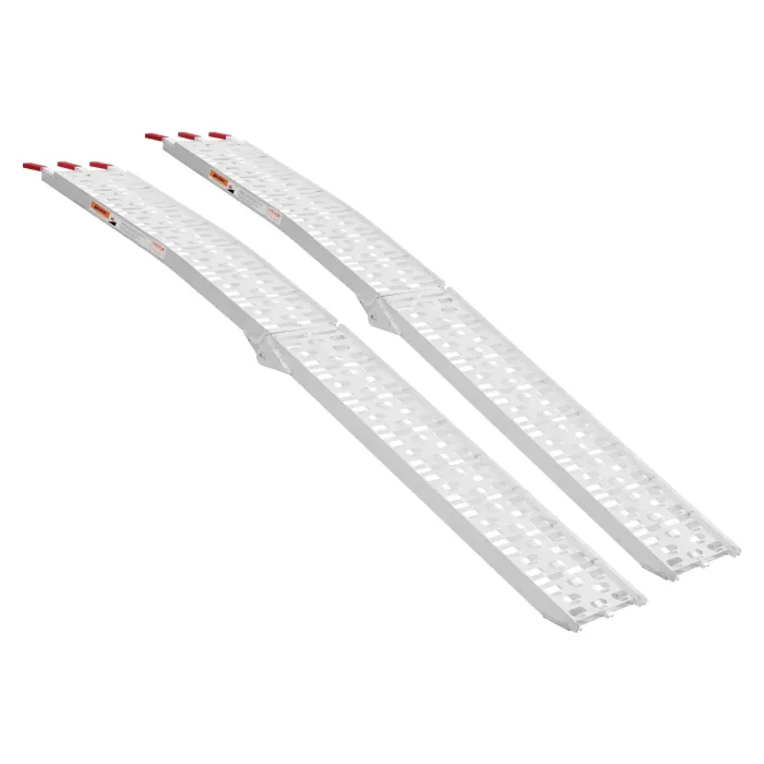 Изработена от изцяло алуминий с прецизно заваряване и плътно уплътнени съединения, рампата има устойчива на корозия повърхност и гладки ръбове без грапавини. Удебелената, разширена повърхност на рампата разпределя равномерно теглото, осигурявайки издръжливост без напукване или срутване с течение на времето. Тази сводеста рампа поддържа комбиниран товароносимост до 680 кг, предлагайки лека, но здрава конструкция. Комплектът от 2 части е идеален за транспортиране на ATV, UTV, мотоциклети, косачки за трева и електрически скутери.