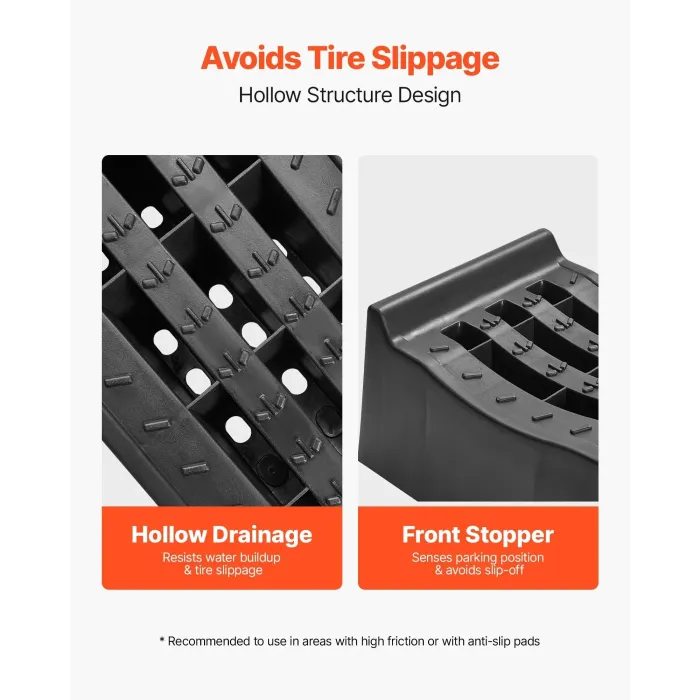 Тези рампи за смяна на масло имат повърхност с форма на пчелна пита, която увеличава триенето и подобрява дренажа, което намалява натрупването на влага и приплъзването на гумите. Извитата форма приляга гумата здраво, поддържайки автомобила стабилен и фиксиран на място.