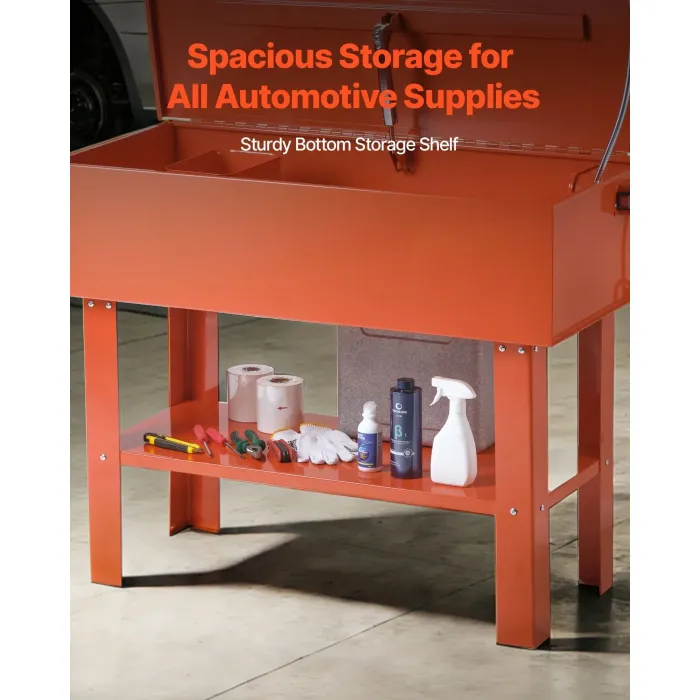 С просторен рафт за съхранение в долната част, почистващата машина за части лесно организира различни автомобилни консумативи, което е много практично. Изработена от прахово покритие, устойчиво на ръжда и корозия, тя гарантира дълготрайна употреба.