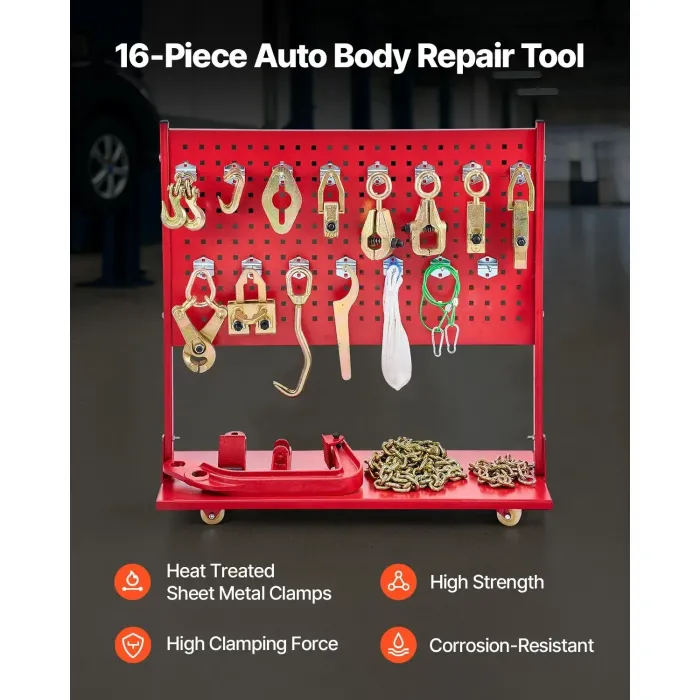 Комплект инструменти за изправяне от 16 части: Нашият инструмент за изправяне на каросерии на автомобили се предлага със скоби за ламарина и основни инструменти за ремонт на каросерии на автомобили. А двойната фиксираща скоба осигурява здраво и стабилно затягане за безопасност по време на изправяне.