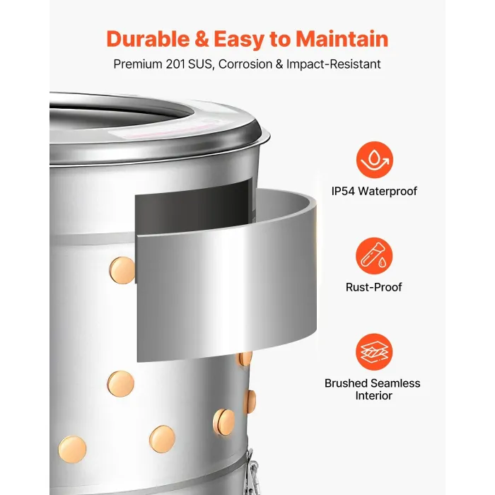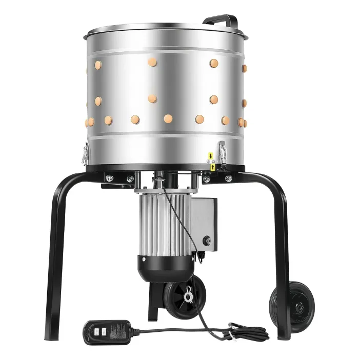 Изработена с електрически корпус, устойчив на атмосферни влияния и клас на защита IP54 за сигурност. Неръждаема стомана 430 за хранителни цели и устойчив на корозия дизайн за външна употреба гарантират издръжливост. Нашата електрическа машина за скубане на птици с подсилени крака и колела осигурява дълготрайна стабилност.