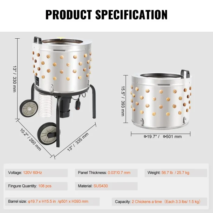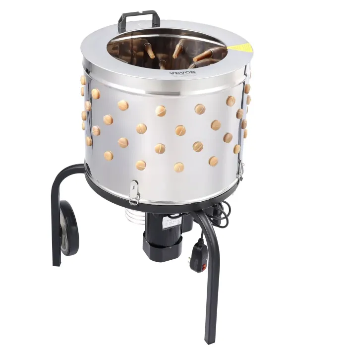 Машината за скубане на пера има 108 гумени пръста, които работят нежно за премахване на пера и мръсотия от домашните птици. Барабанът е изработен от висококачествена неръждаема стомана 430, което гарантира дълготрайната му употреба.