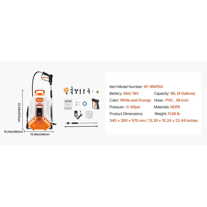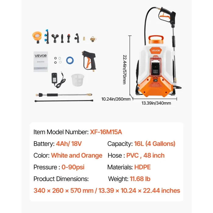 Акумулаторна гръбна пръскачка VEVOR XF-16M15A-US/ 18V/ 4Ah