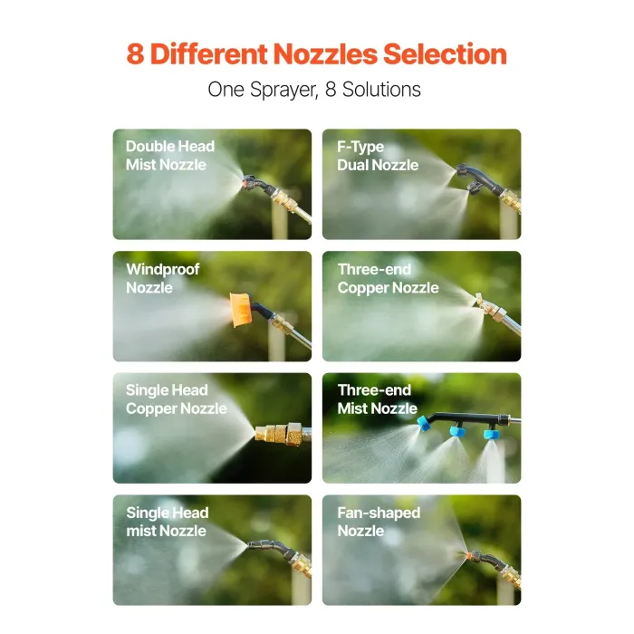 Тази 12-литрова батерийна пръскачка за гръб поддържа множество приложения за пръскане благодарение на осемте си сменяеми дюзи. Потребителите могат да адаптират вида на пръскането към задачата, тъй като всяка дюза създава различен модел на пръскане. За фини задачи използвайте фокусирано пръскане; за по-големи площи използвайте широко пръскане.