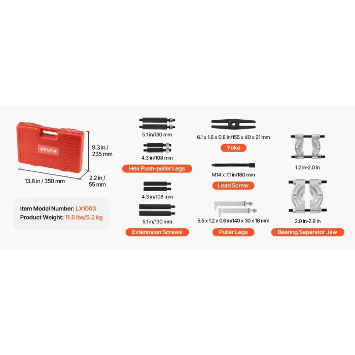 Комплекта за сваляне на лагери включва два разделителя, четири шестостенни крачета за издърпване, четири удължителни винта, винт, две крачета за издърпване и вилка. Всичко е спретнато организирано във водоустойчива кутия за съхранение, лесна за носене и съхранение.