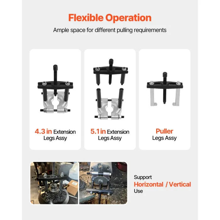Удълженият винт на комплекта издърпвачи осигурява повече място за издърпване на различни лагери. Добавете двойни крачета за издърпване тип „нокът“, използваеми хоризонтално или вертикално. Винт клас 8.8 със сферичен накрайник осигурява плавно и равномерно налягане.