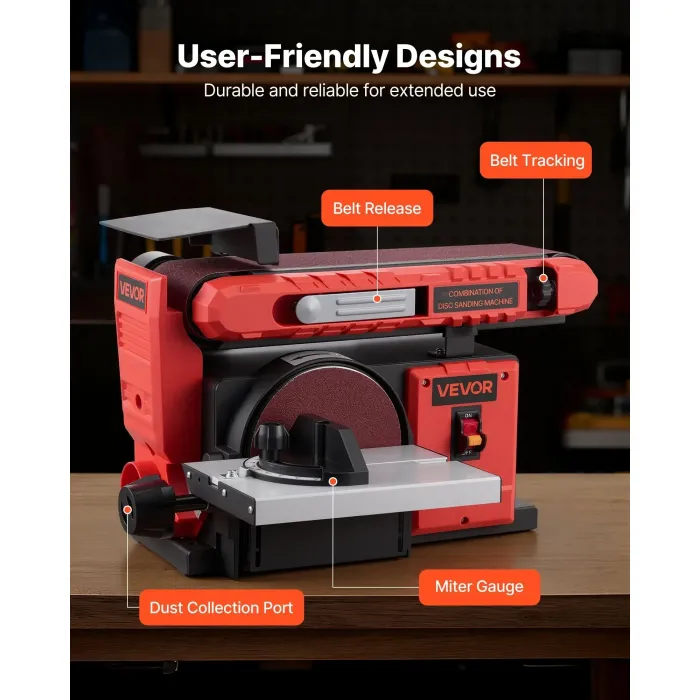 Шлайф лентата може да се регулира от 0 до 90°, което позволява както хоризонтално, така и вертикално шлайфане, осигурявайки гъвкавост за прецизно справяне със задачите за шлайфане за гладки и равномерни завършеци. Комбинацията от дискова шлайфмашина VEVOR 6" и лентова шлайфмашина 4" x 36" се захранва от 400W мотор, като дискът работи с 2980 об/мин, а лентата - с 500 об/мин, осигурявайки мощна мощност за ефективно изпълнение на различни задачи по шлайфане.