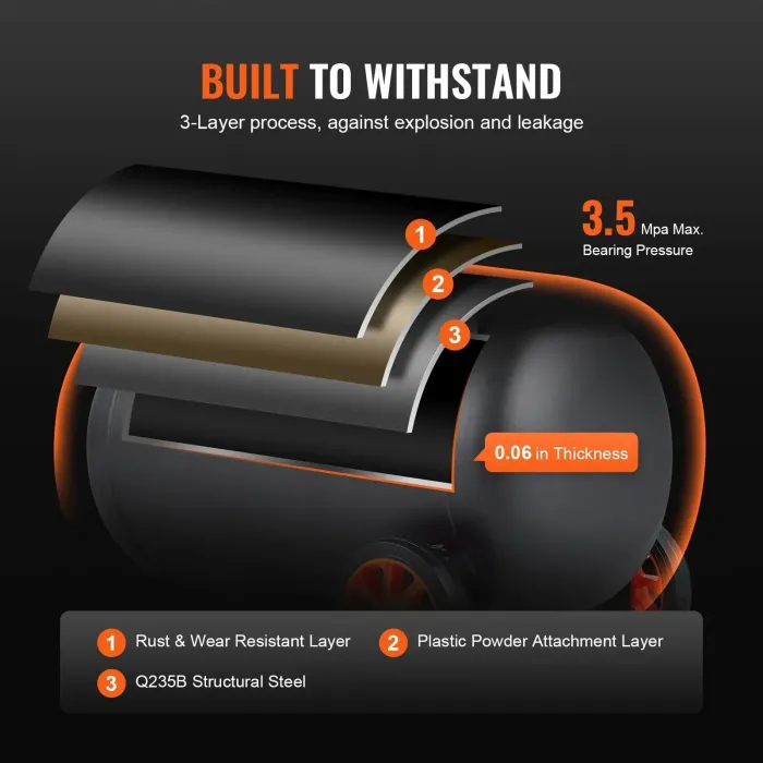 Електрически въздушен компресор е конструиран чрез 3-слоен процес: слой, устойчив на ръжда и износване, слой от пластмасов прахообразен закрепващ материал и конструкционна стомана Q235B, осигуряваща издръжливост и изключителна устойчивост на ръжда. Максималното налягане на лагера от 3,5 Mpa и безшевната заваръчна конструкция гарантират способността му да издържа на експлозии и течове.