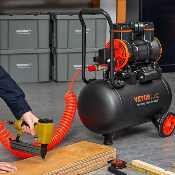 Ултратихият въздушен компресор на VEVOR с ниско ниво на шум (70 dB) е изграден с 2 качествени шумозаглушителя. Всеки ауспух се състои от удебелен капак, гумена тръба на ауспуха и филтърна вата. Това не само намалява шума, но и ефективно предотвратява навлизането на фин прах.