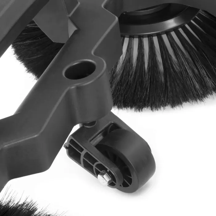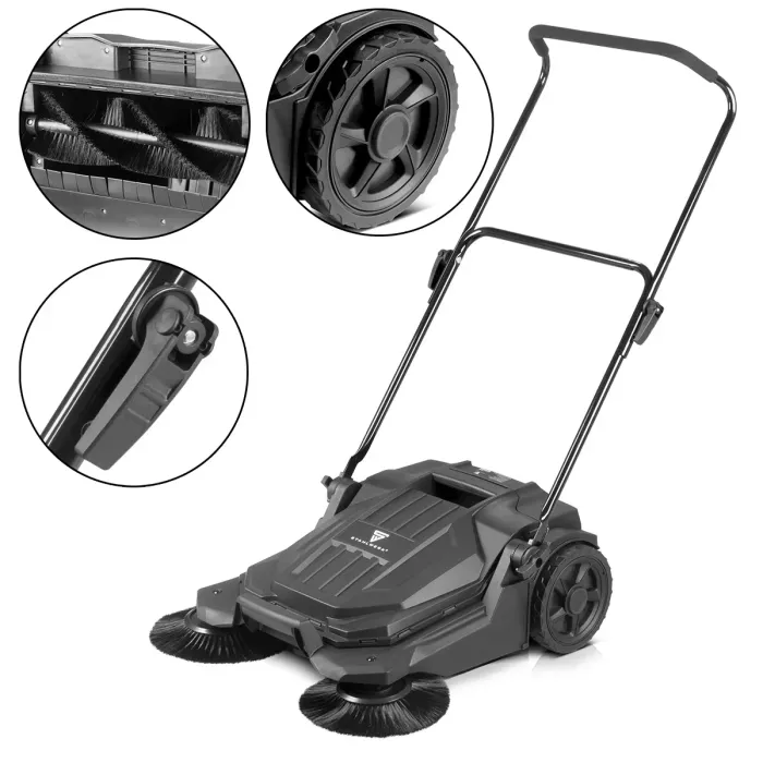 Здравите влакна на ръчната метачка надеждно отстраняват замърсявания, прах или остатъци от кал и разхлабват дори упорити отлагания. Двете странични четки и вътрешната четка на ръчната метачка се адаптират гъвкаво към теренните условия на обекта и могат да се справят дори с неравни повърхности. Ръчната метачка впечатлява с широка ширина на метене от 650 мм и голям капацитет от 20 литра. Тъй като производителността на метене на подовата метачка е от четири до шест пъти по-висока от тази на ръчните метли, дори по-големи площи могат да бъдат почистени ефективно за кратко време. Дръжката на подовата метачка е регулируема на височина на две степени и има мека дунапренена подложка за удобна работа. Гумирано въртящо се колело и две големи гумирани колела с противоплъзгащ профил осигуряват на ръчната метачка сигурен захват и осигуряват лесно маневриране. 20-литровият контейнер за събиране на метачката безопасно улавя мръсотията и праха.