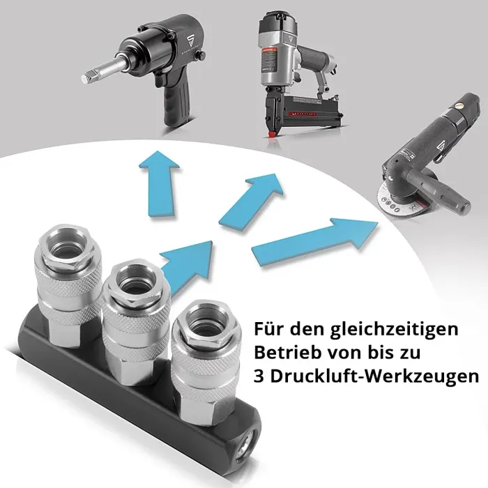 Този комплект съдържа четири внимателно подбрани, висококачествени компонента, които са перфектно съчетани един с друг и ви предлагат максимална гъвкавост и производителност. Идеален за любители „Направи си сам“, работилници и професионална употреба. Сърцето на комплексния комплект е изключително тихият въздушен компресор. С едва 70 dB, той работи тихо като шепот, докато 10-литровият му резервоар и мощният му двигател с мощност 1,97 к.с. (1,45 kW) осигуряват максимално работно налягане от 8 бара. Безчетковата технология с ниско износване осигурява особено дълъг експлоатационен живот. Пълният комплект за сгъстен въздух с компресор, маркуч, дигитален пистолет за напомпване на гуми и 3-кратен адаптер е перфектното пълно оборудване за всички приложения със сгъстен въздух. За гъвкаво използване на компресора, в доставката са включени петметров спирален маркуч за сгъстен въздух и 3-кратен разпределител на сгъстен въздух. Спиралният маркуч, изработен от здрав полиуретан, е устойчив на прегъване и разкъсване и тежи само 600 г. Той осигурява необходимия обхват и гъвкавост за всички задачи и е оборудван с бързосвързваща връзка и щепсел. Дигиталният помпа за гуми позволява прецизно измерване, напомпване и изпускане на въздух. Точен дигитален дисплей предоставя точни стойности в диапазона от 0 до 16 бара с отклонение от само ± 0,3 PSI. Здравият 3-пътен разпределител на сгъстен въздух е изработен от масивен алуминий и месинг и позволява едновременната работа на до три инструмента за сгъстен въздух с максимално работно налягане от 35 бара. Пълният комплект за сгъстен въздух STAHLWERK е идеалният избор за всеки, който цени качеството и ефективността.