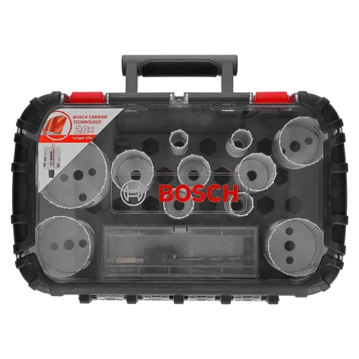 Комплектът включва 11 боркорони с работна дължина 44 мм и диаметър 20, 22, 25, 32, 35, 40, 44, 51, 60, 68 и 76 мм, 1 адаптор Power Change Plus Hex 11 mm и 2 HSS центриращи свредла в пластмасово куфарче.