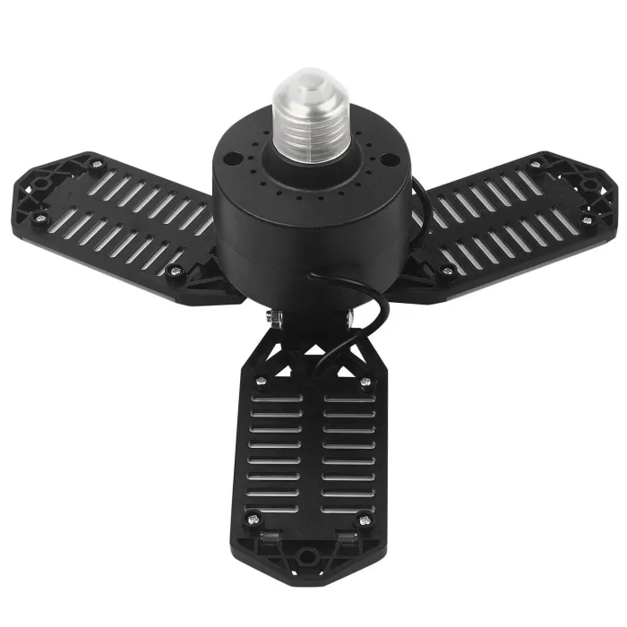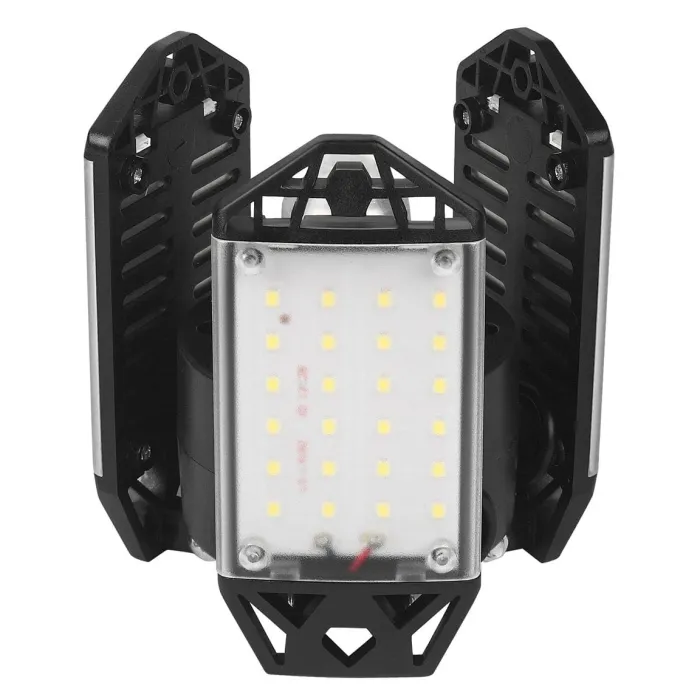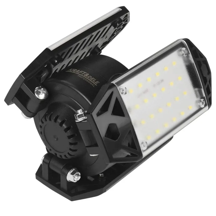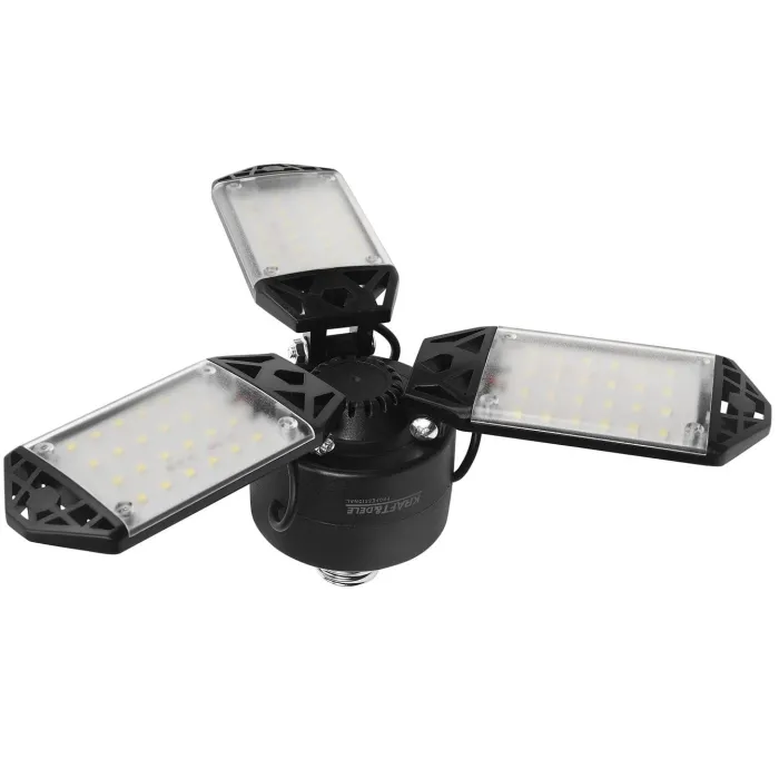 С изходна мощност 80 W и 8500 лумена светлинен поток, лампата осигурява ярка светлина, като същевременно спестява до 85% енергия. Изработена от издръжливи ABS и PC материали и оборудвана с ефективен дизайн за разсейване на топлината, лампата се гордее с дълъг експлоатационен живот дори при интензивна употреба. Монтажът е бърз и лесен благодарение на стандартния цокъл E26/E27 и широкия диапазон на напрежение. Таванното осветително тяло за гараж KD3483 е модерно, енергийно ефективно LED осветително тяло, което осигурява мощна и равномерна светлина в големи, тъмни пространства като гаражи, мазета, складове и работилници. Оборудвано с три регулируеми светлинни панела, които могат да се позиционират свободно, то ви позволява да насочвате светлината точно там, където ви е най-необходима.