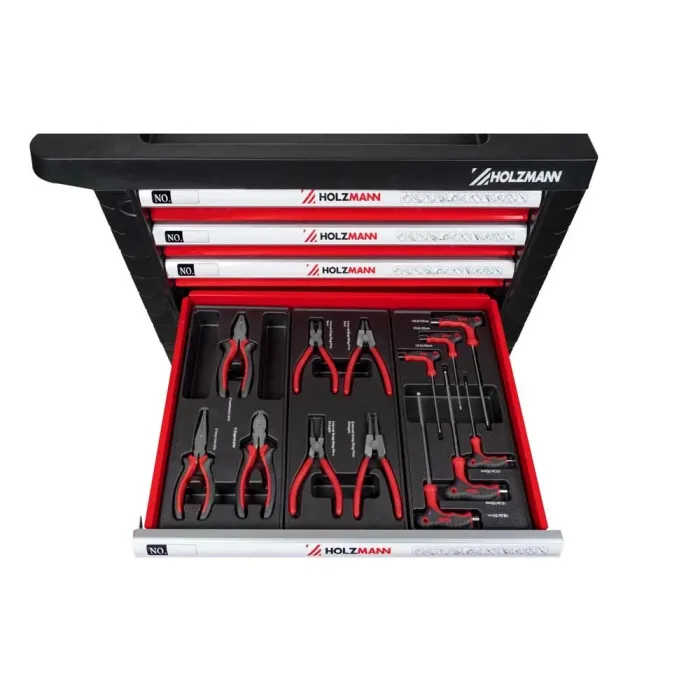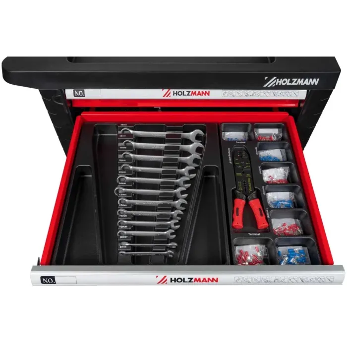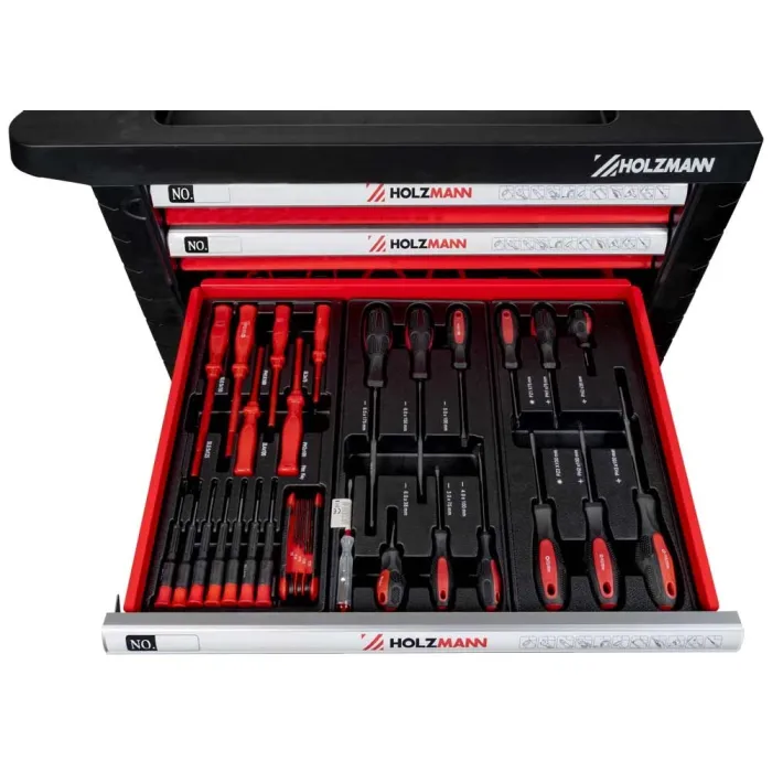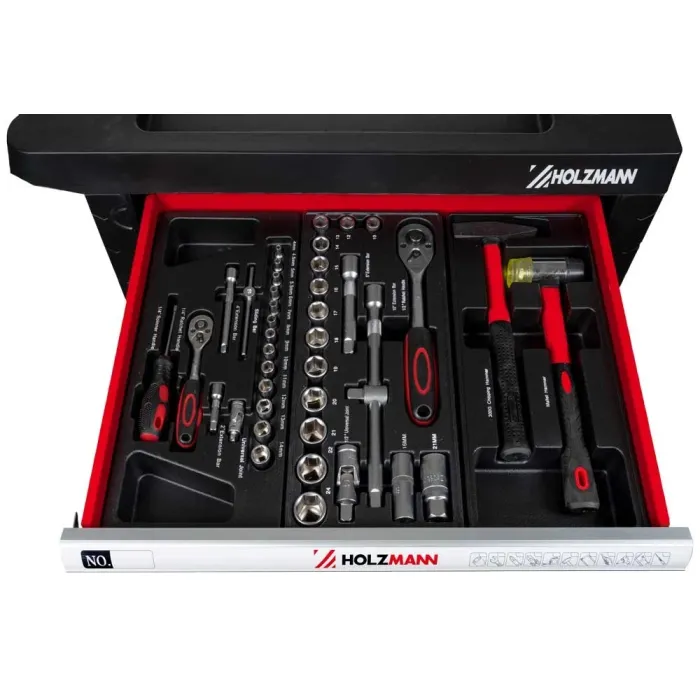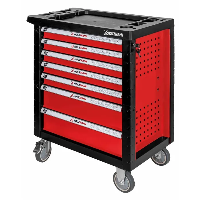 Плавно въртящите се колела със спирачки осигуряват лесна мобилност и стабилна стойка. Количката се предлага с богат комплект инструменти от 261 части, изработени от висококачествена хром-ванадиева стомана – идеални както за професионална, така и за домашна употреба. Шкафовете за инструменти HOLZMANN WW770W разполагат със седем чекмеджета в два различни размера, всички оборудвани с плавно движещи се сачмени лагери. Те предлагат практична повърхност за съхранение, здрава дръжка и ключалка за сигурно затваряне на чекмеджетата.