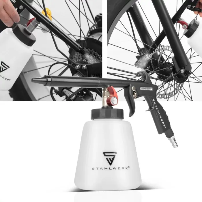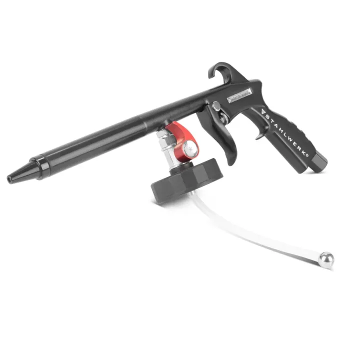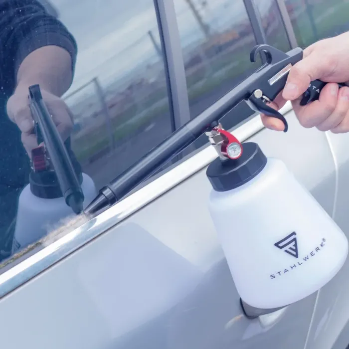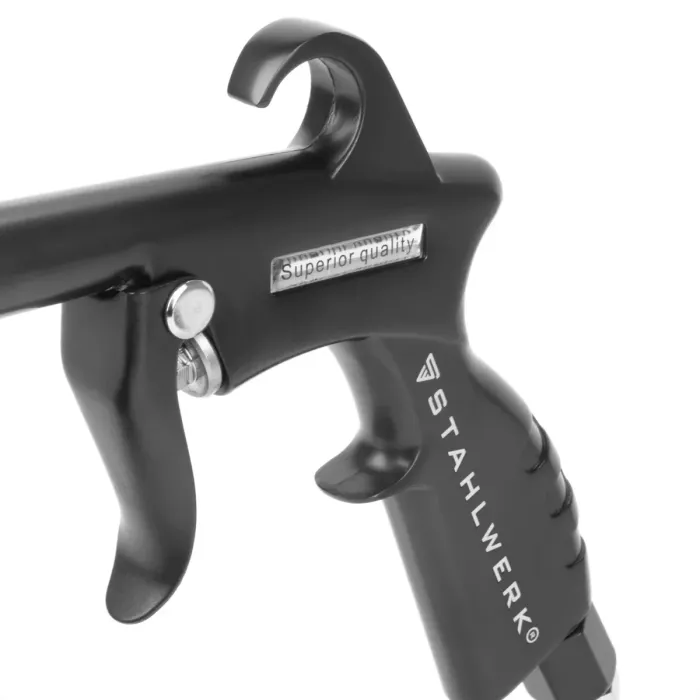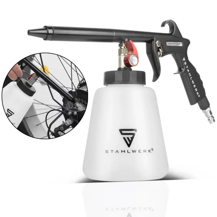 Благодарение на функцията 2 в 1, уредът за почистване със сгъстен въздух е многофункционален: когато дозиращият клапан е затворен, устройството може да се използва като пистолет за издухване, а когато клапанът е отворен, може да се използва като пистолет за почистване. Пистолетът за почистване има фино регулируем дозиращ клапан за добавяне на почистващи течности и може да се използва със или без почистващ препарат. Ергономичният дизайн и ниското тегло позволяват комфортна работа без умора дори при продължителни периоди на работа. Уредът за почистване със сгъстен въздух е идеален за почистване на превозни средства, електрически уреди и за универсална употреба в промишлеността, търговията, търговията и „Направи си сам“. Пистолетът за почистване със сгъстен въздух STAHLWERK е идеален за прецизно и селективно почистване на труднодостъпни места. Уредът за почистване на интериор надеждно премахва остатъци, мръсотия и прах от обзавеждане, тапицерия, таван, вентилационни отвори, панели на врати, килими, стелки, метални, дървени или пластмасови повърхности и много други.