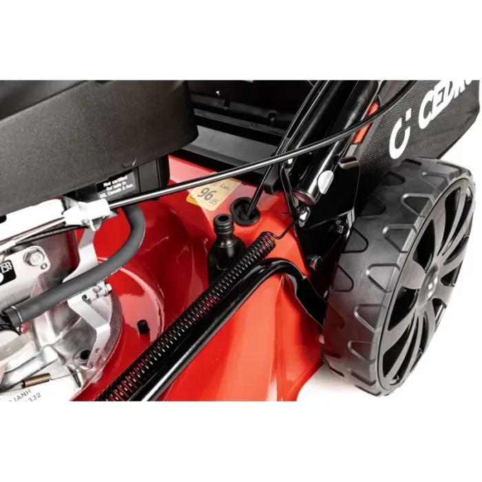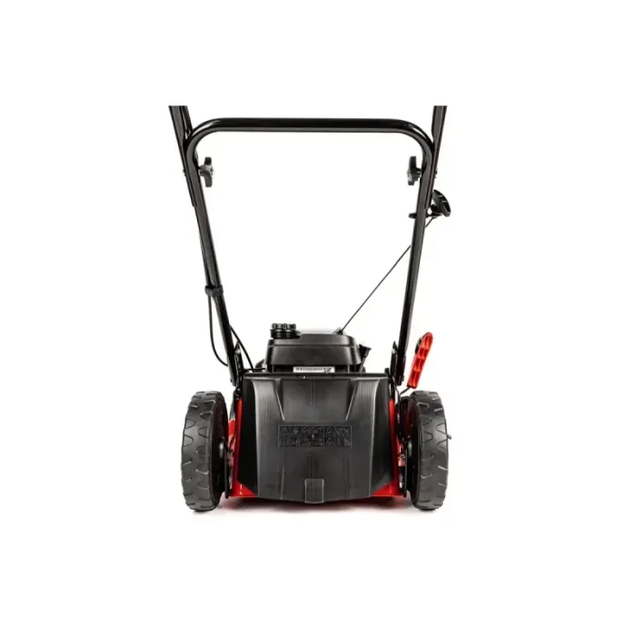 Различните диаметри на колелата (предни 18 см, задни 25 см) осигуряват стабилност и лесна маневреност, а централното регулиране на височината на косене ви позволява да адаптирате машината към вашите индивидуални нужди.
