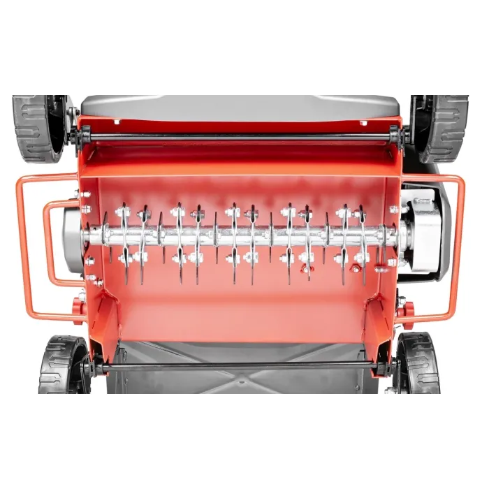 Благодарение на големите колела с размер 7, работата със скарификатора става удобна и комфортна. Въпреки здравата си конструкция, устройството тежи само 44 кг, което го прави лесен за маневриране и съхранение.