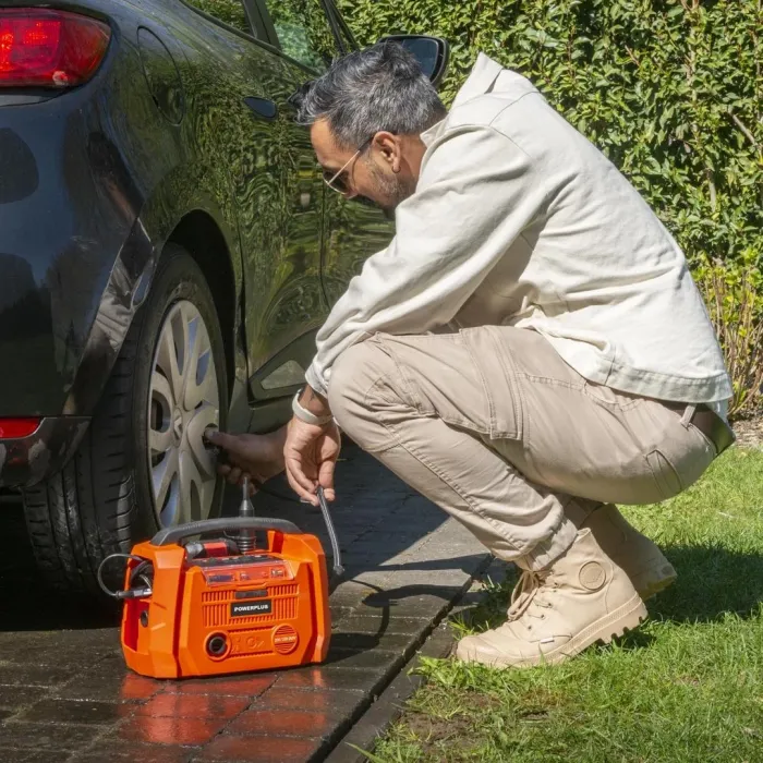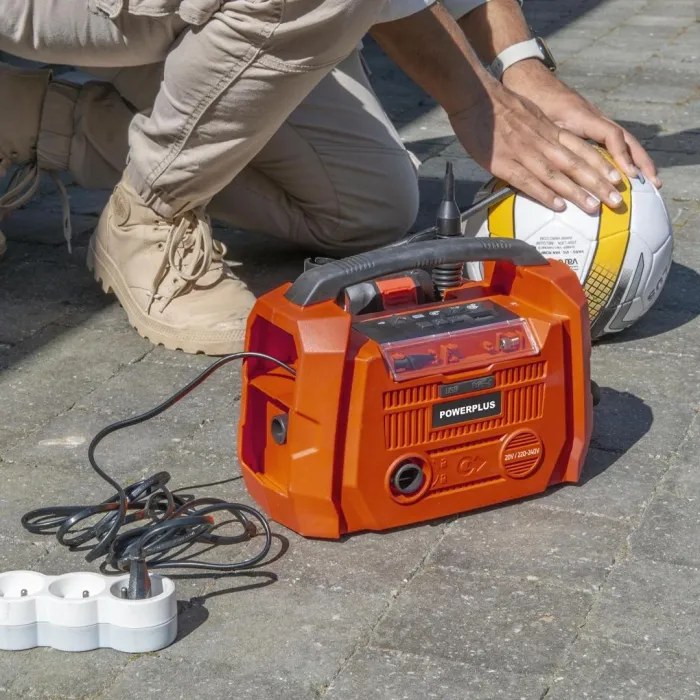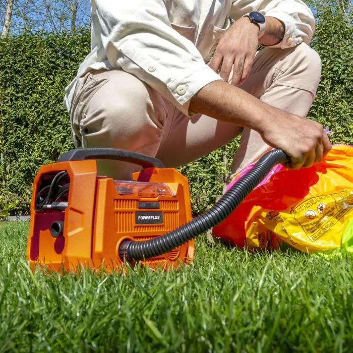 Работи или на електричество, или на мощна 20 V батерия, което го прави идеален за употреба на пътя. Независимо дали сте на полето или в спортен център, вашата футболна или баскетболна топка може да бъде напомпана веднага. Този комбиниран компресор и дефлатор 20 V/220 V от Dual Power може да надуе детския надуваем басейн, но също така може да ви помогне да го изпуснете отново след това. POWDP7031 е много компактен компресор и лесен за транспортиране.