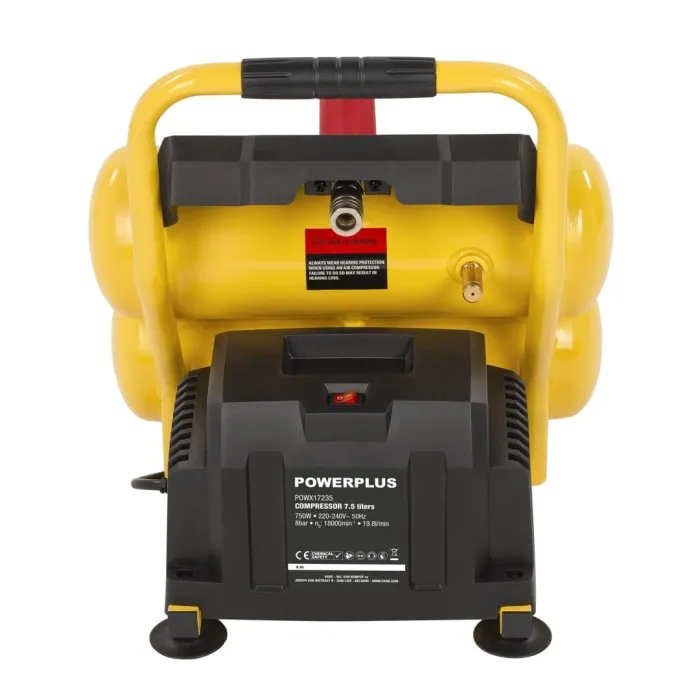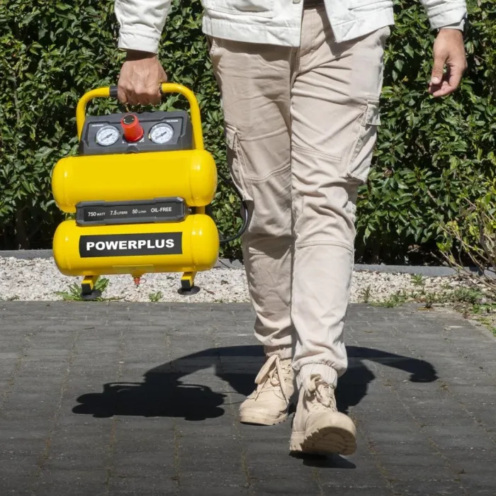 Този безмаслен компресор Powerplus е идеален за напомпване на автомобилни или велосипедни гуми, надуваеми матраци и баскетболни топки. Може да се използва и в комбинация с пневматични инструменти, като пиронник/телбод, въздушен пистолет и други. Този преносим компресор с мощност 750 W осигурява сгъстен въздух, така че можете да го свържете към пневматични инструменти или да го използвате като въздушна помпа. Благодарение на двата си резервоара за въздух можете да работите по-дълго без прекъсвания и те осигуряват по-стабилно подаване на въздух. POWX17235 не изисква масло, което го прави много лесен за поддръжка.