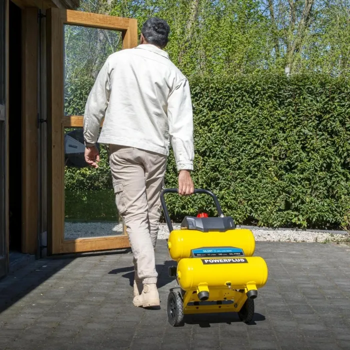 Този безмаслен компресор Powerplus е идеален за напомпване на автомобилни или велосипедни гуми, надуваеми матраци и баскетболни топки. Може да се използва и в комбинация с пневматични инструменти, като пиронник/телбод, бормашина и други. Можете лесно да регулирате налягането с регулатора на налягането до 10 бара, за да го адаптирате към текущата задача.