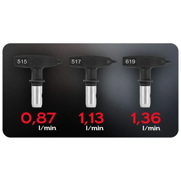 Комплектът включва дюзи 515, 517 и 619, благодарение на които можете да изберете ширината и вида на пръскането, които да отговарят на вида боя и повърхност.