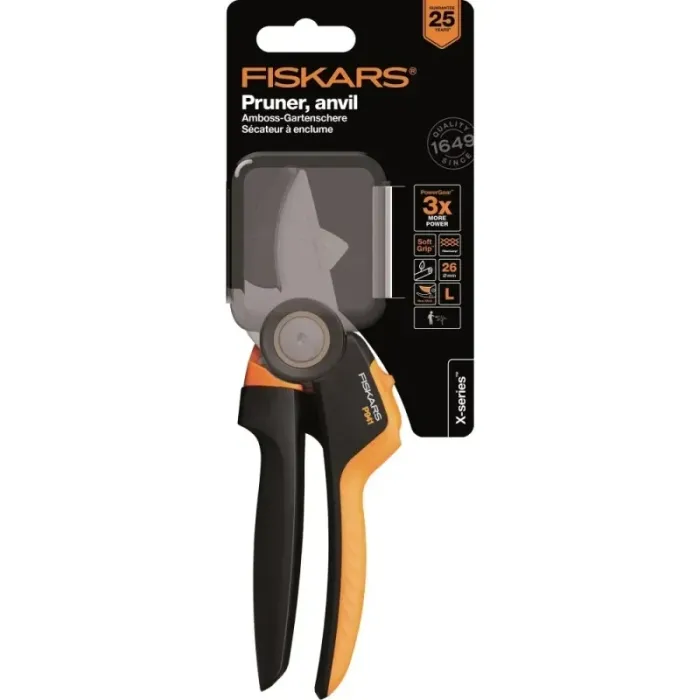 Препоръчва се за рязане на сухи клони с диаметър до 24 мм. Закаленото, прецизно заточено стоманено острие запазва свойствата си за по-дълго време. Устойчивото на корозия острие с покритие минимизира триенето и увеличава ефективността, осигурявайки гладко и чисто рязане. Уникалният механизъм PowerGear™ увеличава мощността на рязане три пъти в сравнение със стандартните механизми. Оборудван с издръжлива наковалня, той реже клони чисто, вместо да ги смачква. Ергономично проектираната дръжка FiberComp™ следва естествената форма на ръката, докато материалът SoftGrip™ и 3D текстурата на дръжките повишават безопасността и комфорта.