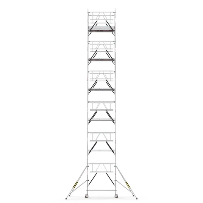 Конструкцията, която е изградена върху солидна алуминиева конструкция, е подсилена със стоманени опори. Изработенo от лек и издръжлив алуминий, което улеснява монтажа и транспортирането. Снабдена с колела с регулируема височина (до 20 см) и спирачна система за лесно придвижване и стабилно позициониране. Платформите имат капацитет на натоварване от 2 kN/m². Скелетата са подходящи за поддръжка, ремонти и строителство на къщи и сгради с високи тавани, външни стени, шоуруми, бензиностанции, фитнес центрове, производствени халета и други. Те са високи, алуминиеви което им дава лекота и леснота при сглабянето им на обект и лесното им съхранение, след като бъдат разглобени на части.