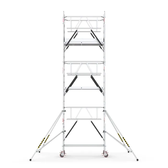 Конструкцията, която е изградена върху солидна алуминиева конструкция, е подсилена със стоманени опори. Изработенo от лек и издръжлив алуминий, което улеснява монтажа и транспортирането. Снабдена с колела с регулируема височина (до 20 см) и спирачна система за лесно придвижване и стабилно позициониране. Платформите имат капацитет на натоварване от 2 kN/m². Скелетата са подходящи за поддръжка, ремонти и строителство на къщи и сгради с високи тавани, външни стени, шоуруми, бензиностанции, фитнес центрове, производствени халета и други. Те са високи, алуминиеви което им дава лекота и леснота при сглабянето им на обект и лесното им съхранение, след като бъдат разглобени на части.