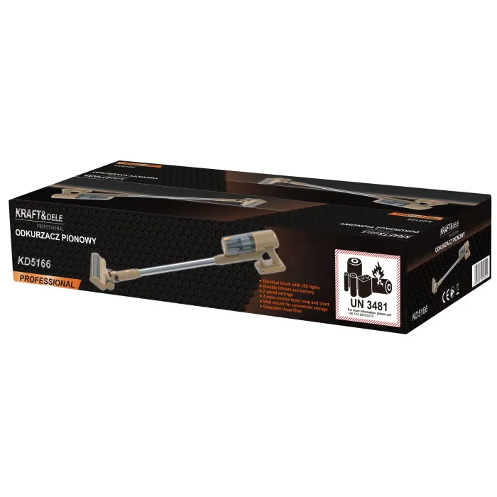 Благодарение на електрическата си четка с LED осветление и две настройки за скорост, почистването е ефективно и удобно, дори на труднодостъпни места. Вертикалната прахосмукачка KRAFT&DELE KD5166 е модерно почистващо устройство, захранвано от батерия 2500mAh, което съчетава комфорт, функционалност и модерен дизайн.