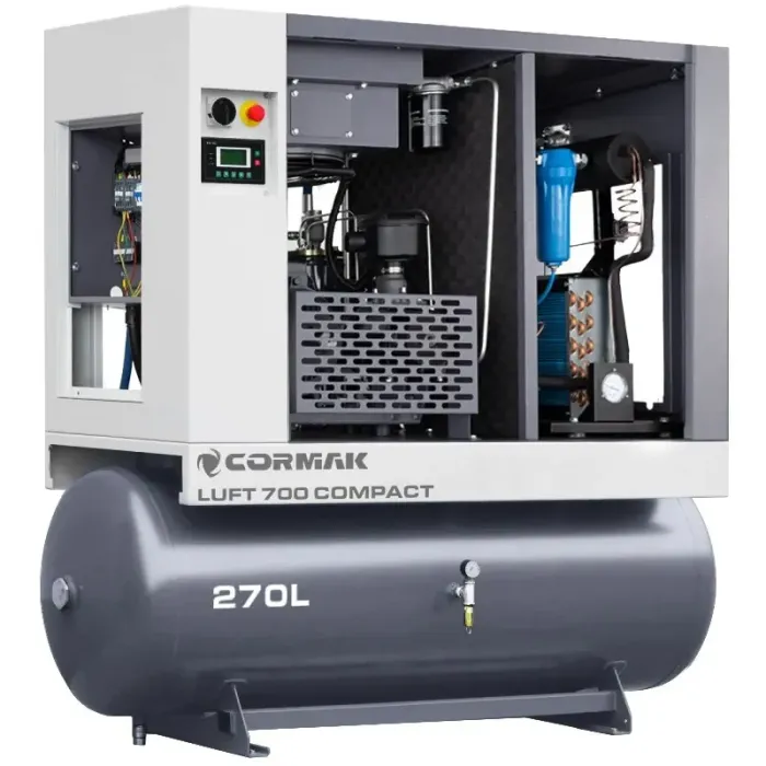 Винтовият компресор LUFT 700 COMPACT с хладилен изсушител на въздуха и 270-литров въздушен резервоар. Серията CORMAK LUFT съчетава най-новите пневматични технологии с висококачествени материали и компоненти. Ниските експлоатационни разходи, лесната работа, ергономичната и издръжлива конструкция, както и високата производителност, осигуряват ефективна и безпроблемна работа.