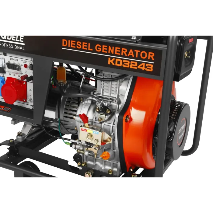 Генераторът KD3243 разполага с два метода на стартиране – ръчен и електрически – които значително опростяват стартирането на машината при различни условия. Стабилизация на напрежението чрез автоматичен кондензатор или AVR система, защита на веригата NFB, AC и DC изходи, аларма за ниско налягане на маслото с автоматично изключване и практични транспортни колела правят генератора интуитивен, безопасен и удобен за употреба.