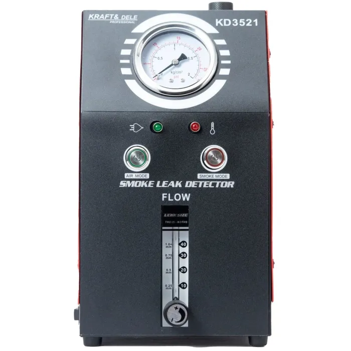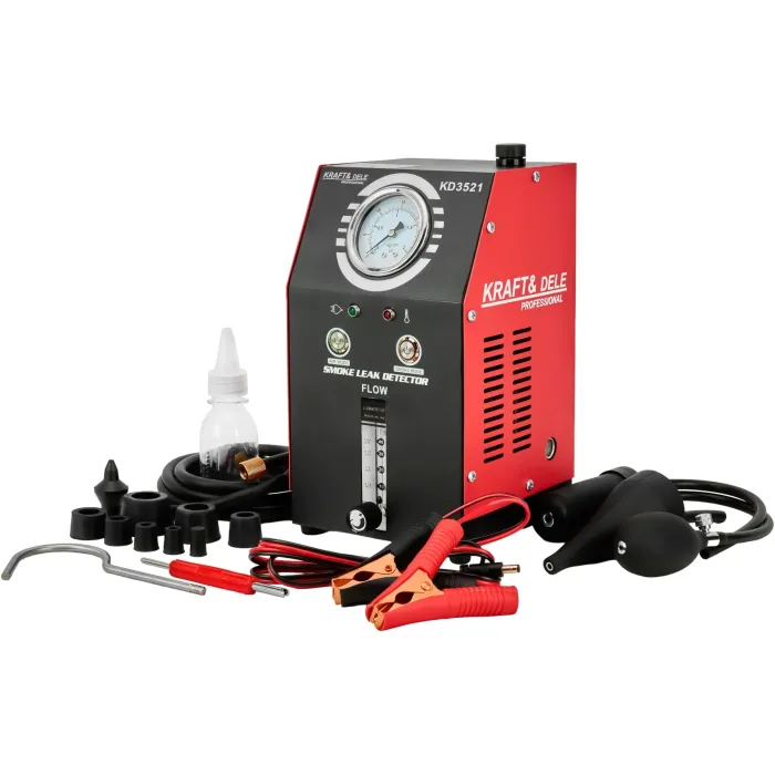 Устройството е предназначено за употреба в леки автомобили, мотоциклети и други тръбопроводни системи. Вградената въздушна помпа елиминира нуждата от външен източник на налягане, а компактният му дизайн го прави лесно за носене и употреба. Генераторът на дим KRAFT&DELE KD3521 е професионално диагностично устройство за откриване на течове в тръбопроводни системи на превозни средства и технически инсталации. Той позволява бързо, безопасно и прецизно локализиране на течове в системи като EVAP система, всмукателни, изпускателни, горивни, охладителни и вакуумни тръбопроводи.