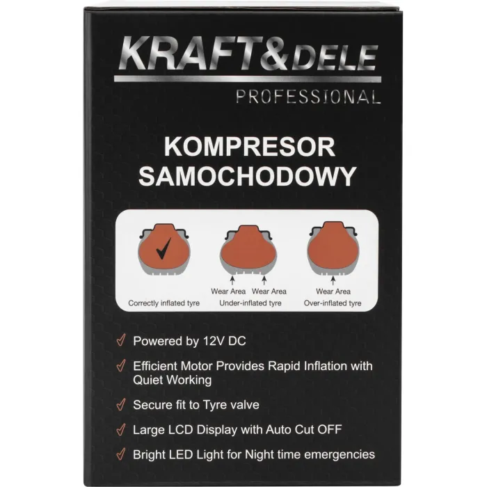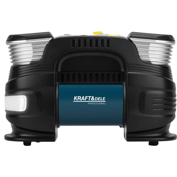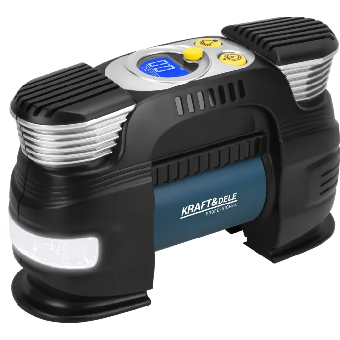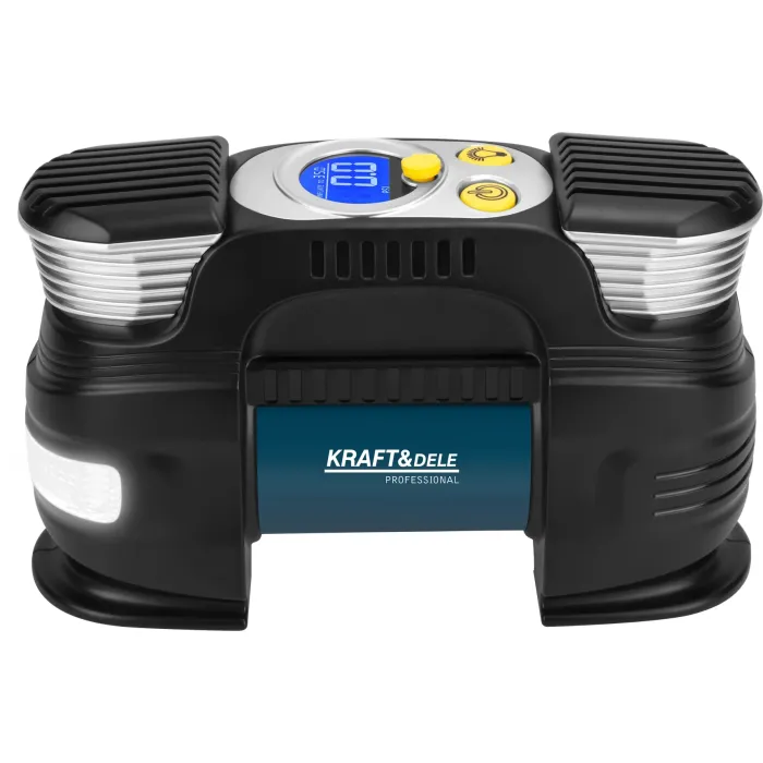 Мощен автомобилен компресор от KRAFT&DELE, предназначен за употреба в по-големи превозни средства и с по-големи гуми. Той е идеален за леки автомобили, каравани, кемпери, офроуд превозни средства, микробуси и ванове, осигурявайки бързо и безопасно напомпване.