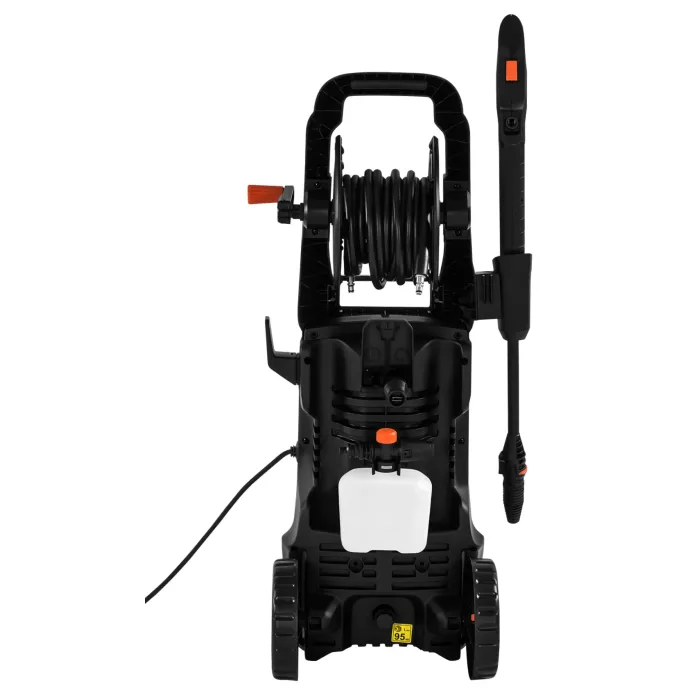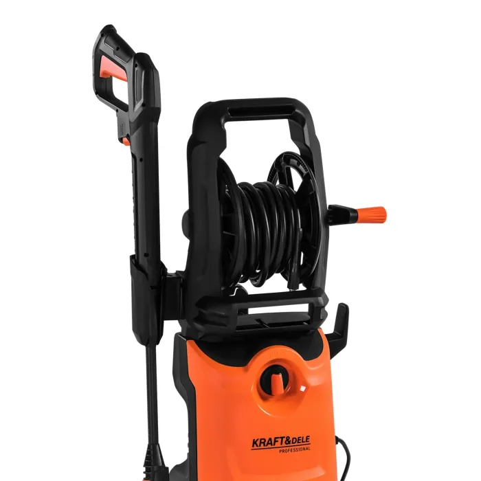 Водоструйката KD5382 разполага с маркуч, който може да се навие на макара в дръжката за лесно съхранение и транспорт. Големите колела и дългата, контурирана дръжка осигуряват удобно транспортиране, а заключването на спусъка на пистолета повишава комфорта и безопасността. Включената дюза за пяна позволява нанасяне на почистващ препарат, а здравата конструкция осигурява издръжливост и надеждност.