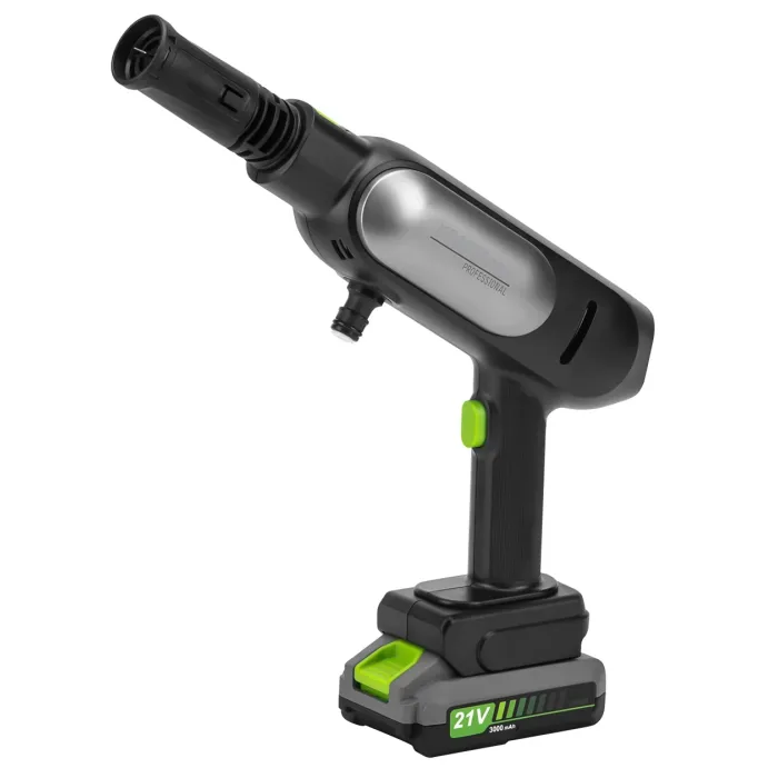 Това не е стандартна стационарна водоструйка с тръба и голямо устройство – това е малко, автономно устройство, захранвано от батерии, което изисква само връзка с вода, осигурявайки пълна мобилност и удобство за работа навсякъде. Водоструйка, захранвана от 21V литиево-йонна батерия. Това е изключително компактен продукт – цялото устройство е малко и леко, което го прави лесно за носене и работа с една ръка.