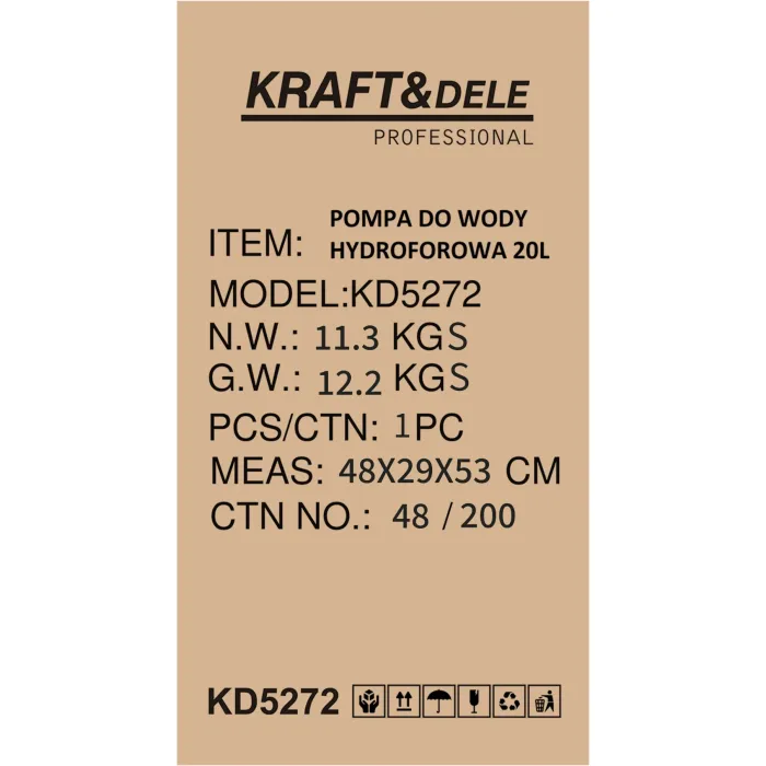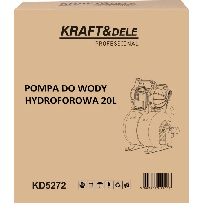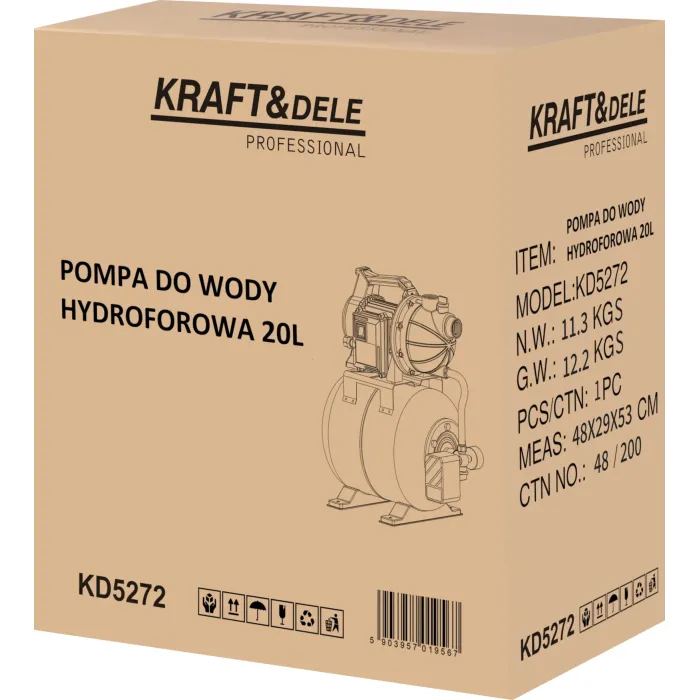 Мощна хидрофорна помпа с мощност 1200 W от KRAFT&DELE, предназначена за поливане на градини, паркове, зеленчукови лехи и поливане с пръскачки за тревни площи. Благодарение на вградения си 20-литров хидрофорен резервоар, устройството осигурява стабилно налягане във водната система и комфортна работа.