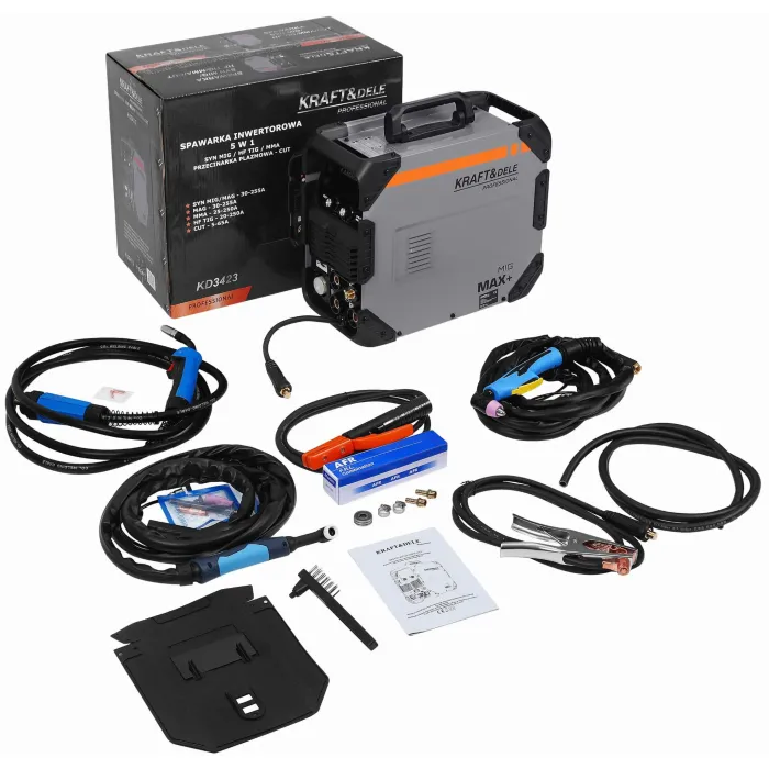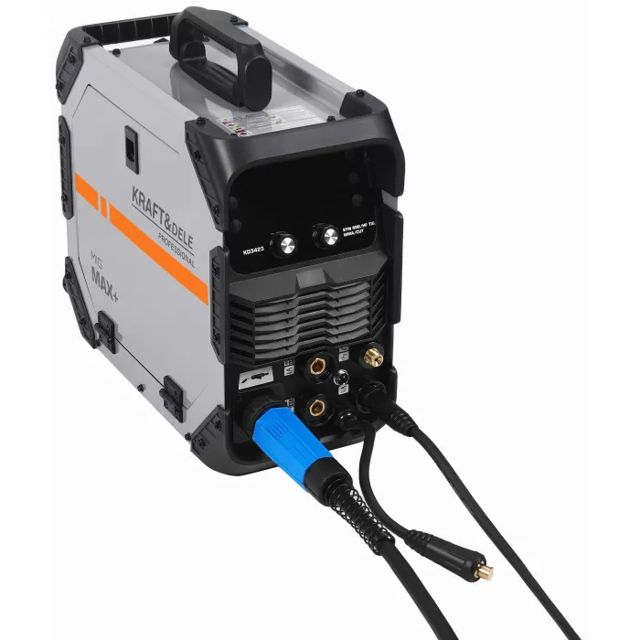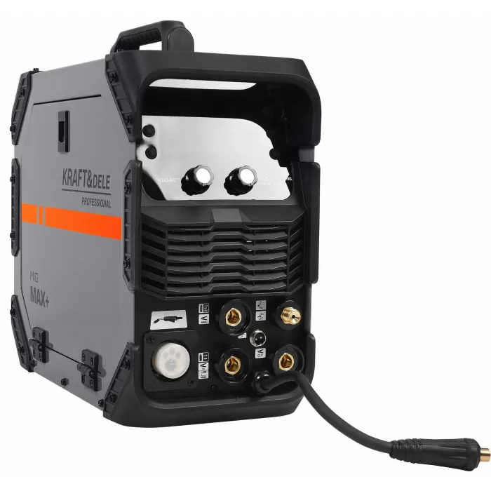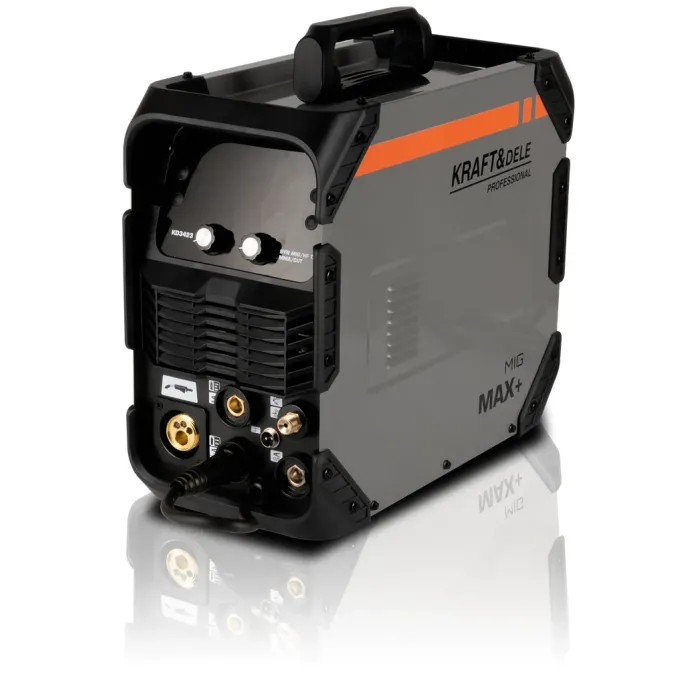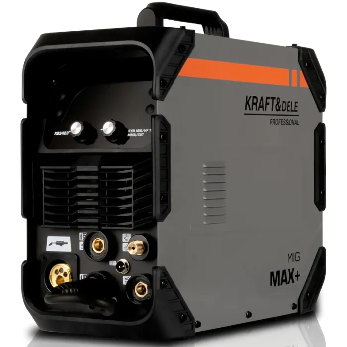 Многофункционален инверторен заваръчен апарат от KRAFT&DELE, оборудван с технологии за MIG, MMA, TIG и плазмено рязане. Проектиран за работа в мобилни работилници, ремонти на място и леки строителни проекти, устройството предлага висока ефективност, стабилна дъга и гъвкава работа, използвайки различни методи за заваряване и рязане на метал.