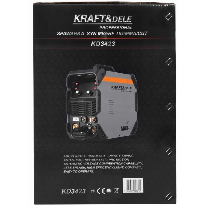 Моделът KD3423 е идеален за любители, „Направи си сам“ ентусиасти и потребители, които търсят едно-единствено, цялостно устройство с широк спектър от приложения. Широкият диапазон от настройки на заваръчния ток, ясният цифров контролен панел и лекотата на използване осигуряват отличен контрол върху процеса на заваряване и прецизно плазмено рязане.