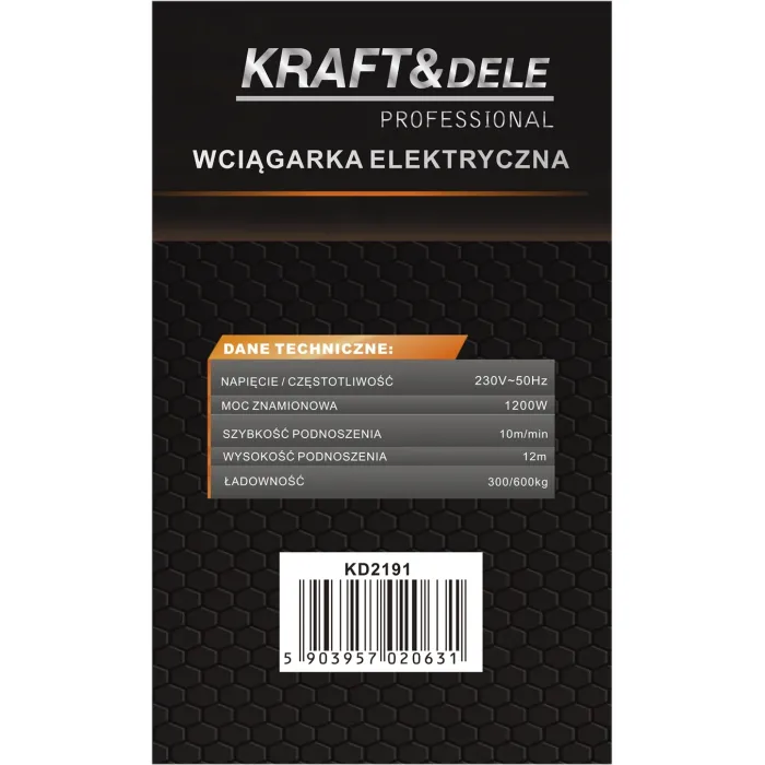 Мощна и ефикасна електрическа лебедка от KRAFT&DELE, предназначена за повдигане и спускане на тежки товари в работилници, строителни площадки и складове. Благодарение на мощния си двигател и здравата си конструкция, устройството е подходящо както за професионални, така и за битови приложения.