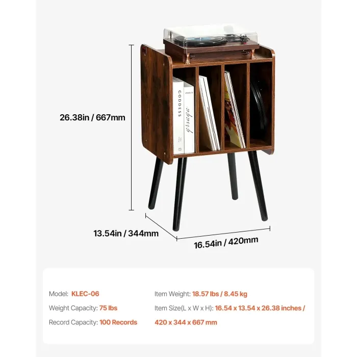 Винтидж кафявите прегради, комбинирани с крака от масивна дървесина, не само изглеждат страхотно, но и осигуряват стабилност и дълготрайна издръжливост на виниловата стойка за плейър.