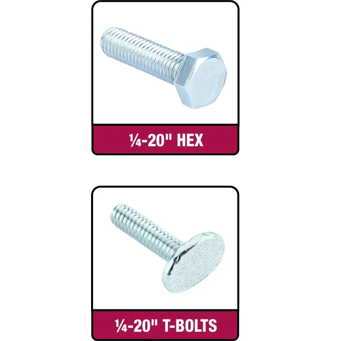 Универсалната система Milescraft® T-Trax разполага с Т-образен слот, който приема както Т-образни болтове 1/4-20”, така и шестостенни болтове 1/4-20″. Това ви позволява да използвате всички необходими крепежни елементи и аксесоари за T-Track.