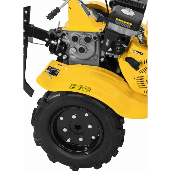 Машината е оборудвана с двигател с мощност 10 к.с., работещ с номинална скорост от 3600 об/мин. Задвижването и стабилната конструкция осигуряват ефективна работа дори при трудни почвени условия. Фрезата има две предни предавки, неутрална предавка и задна предавка, което прави маневрирането ѝ значително по-лесно при работа в градината. Широката работна ширина позволява ефективна обработка на по-големи площи.