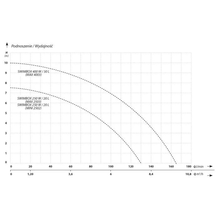 За моделите SWIMBOX 250 W / 20 l (MAX 2503) и SWIMBOX 250 W / 20 l (MINI 2502) максималната височина на повдигане е 7,5 м, с дебит до 130 л/мин и консумация на енергия от 250 W. Тези версии се различават основно по размерите си: MAX 2503 – приблизително 630 × 420 × 480 мм и тегло 10 кг, MINI 2502 – приблизително 630 × 300 × 480 мм и тегло 9,8 кг. Моделът SWIMBOX 400 W / 30 l (MAX 4003) предлага височина на повдигане до 10 м, дебит до 165 л/мин, мощност 400 W, размери от приблизително... 730 × 420 × 500 мм и тегло 10,6 кг.