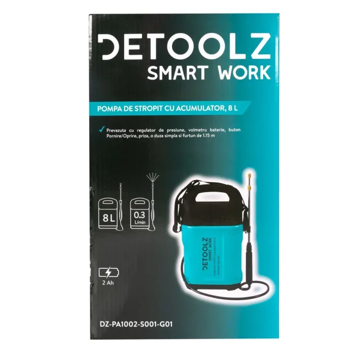С резервоар от 8 литра и електрическо задвижване , тази помпа осигурява равномерно покритие и намалено физическо усилие , благодарение на автоматичната работа и удължената автономност. Ефективно пръскане за растителна защита и дезинфекция на пространства! Пръскачката Detoolz DZ-PA1002-S001-G01 е компактно, лесно за употреба и ефикасно оборудване , идеално за пръскане на водни разтвори , включително пестициди, торове, дезинфектанти или вода за напояване .